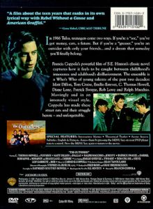 Francis Coppola's powerful film of S.E. Hinton's classic novel captures how it feels to be caught between childhood's innocence and adulthood's disillusionment. The ensemble is a Who's Who of young talents of the past two decades: Matt Dillion, Tom Cruise, Emilio Estevez, C. Thomas Howell, Diane Lane, Patrick Swayze, Rob Lowe and Ralph Macchio. Movingly and in an intesely visual style, Coppola has made these street rats and their struggle heroic - and unforgettable. |