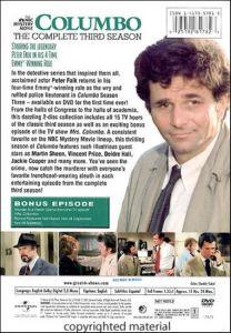 | In the detective series that inspired them all, acclaimed actor Peter Falk returns in his four-time Emmy®-winning role as the wry and ruffled police lieutenant in Columbo Season Three - available on DVD for the first time ever! From the halls of Congress to the halls of academia, this dazzling 2-disc collection includes all 15 TV hours of the classic third season as well as an exciting bonus episode of the TV show Mrs. Columbo. A consistent favorite on the NBC Mystery Movie lineup, this thrilling season of Columbo features such illustrious guest stars as Martin Sheen, Vincent Price, Deidre Hall, Jackie Cooper and many more. You’ve seen the crime, now catch the murderer with everyone’s favorite trenchcoat-wearing sleuth in each entertaining episode from the complete third season! |
