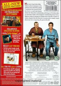 Over 35 Never-Before-Seen Outrageous Outtakes! Hilarious Deleted Scenes Including "De Niro Unplugged " - an uproariously funny deleted scene of Robert De Niro singing during the wedding. Silly Cat Tricks - The film's animal wrangler reveals how Jinx the cat was trained for his amazing on-screen antics. The Truth About Lying Do lie detectors tell all? A polygraph expert from the NBC series Meet My Folks reveals the eye-opening truth about detecting deception |