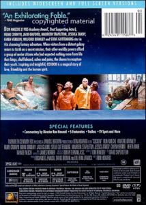 Don Ameche (1985 Academy Award, Best Supporting Actor), Hume Cronyn, Jack Gilford, Maureen Stapleton, Jessica Tandy, Gwen Verdon, Wilford Brimley and Steve Guttenberg star in this charming fantasy adventure. When visitors from a distant galaxy return to Earth on a secret mission, their other-worldly powers afford a group of senior citizens who have expected nothing more from life than bingo, shuffleboard, aches and pains, the chance to capture their youth. Inspiring and insightful, Cocoon is a magical story of love, friendship and the human spirit. |
