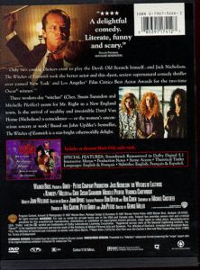 | Alex, Jane, and Suki are three bored New England woman left to live without their husbands. They innocently conjure up a mystery man, who could satisfy all their desires. A new man moves into town - and he fits the bill perfectly. Daryl Van Horne is filthy rich and wild eyed, and within days the three women have all discovered almighty power within themselves. Will good triumph over evil, or will Daryl continue to have his evil way with his witches? |