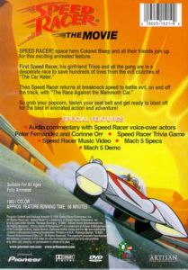 Audio Commentary with Speed Racer Voice-Over Actors Peter Fernandez and Corinne Orr Speed Racer Trivia Game Speed Racer Music Video Mach 5 Specs Mach 5 Demo