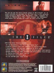 "The Truth About Season Four" Documentary 8 Special Effects Clips with Commentary by Producer Paul Rabwin 9 Deleted Scenes with Optional Commentary by Chris Carter Episode Commentary from "Memento Mori" by Writer/Producer Frank Spotnitz Episode Commentary from "Small Potatoes" with Writer/Producer Vince Gilligan 13 "Behind-The-Truth" Spots From F/X 48 Promotional Television Spots All New DVD-ROM Game "Urbs Tertia"