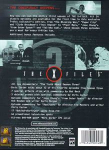 All New Documentary: "The Truth About Season Three" Chris Carter Talks About 12 Of His Favorite Episodes From Season Three 7 Special Effects Clips with Commentary by Mat Beck 5 Deleted Scenes with Optional Commentary by Chris Carter Episode Commentary for "Jose Chung's 'From Outer Space'" by Director Rob Bowman and Writer Darin Morgan Episode Commentary for "Apocrypha" by Director Kim Manners and Writer Chris Carter 17 "Behind-The-Truth" Spots From F/X 46 Promotional Television Spots All-New DVD-ROM Game "Mere Worlds"