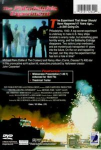 Philadelphia, 1943: A top-secret experiment is underway to make U.S. Navy ships invisible to enemy radar, but something goes horribly wrong, and the Battleship Eldridge disappears. Two sailors jump overboard -- and are mysteriously transported 41 years into the future. On the run and trapped by the past, can they stop the experiment that has torn a hole in time?