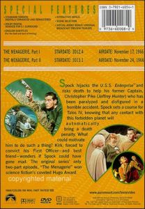 The Menagerie, Parts I and II (Episode 16) Spock hijacks the U.S.S. Enterprise and risks death to help his former Captain, Christopher Pike (Jeffery Hunter) who has been paralyzed and disfigured in a horrible accident. Spock sets a course for Talos IV, knowing that any contact with this forbidden planet will automatically bring a death penalty. What could motivate him to do such a thing? Kirk, forced to convict his First Officer - and best friend - wonders if Spock could have gone mad. The original series' only two-part episode, The Menagerie won science fiction's coveted Hugo Award. |