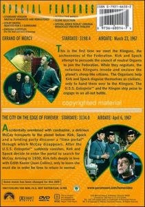 Errand Of Mercy: (Episode 27) This is the first time we meet the Klingons, the archenemies of the Federation. Kirk and Spock attempt to persuade the council of neutral Organia to join the Federation. While they negotiate, the nefarious Klingons invade and enslave the planet's sheep-like citizens. The Organians help Kirk and Spock disguise themselves as civilians, only to hand them over to the Klingons. The U.S.S. Enterprise and the Klingon ship poise to engage in an all-out battle.