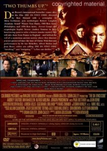 | Dan Brown's international bestseller comes alive in the film The Da Vinci Code, directed by Ron Howard with a screenplay by Akiva Goldsman. Join symbologist Robert Langdon (Academy Award® Winner Tom Hanks, 1993 Best Actor, Philadelphia, and 1994 Best Actor, Forrest Gump) and cryptologist Sophie Neveu (Audrey Tautou) in their heart-racing quest to solve a bizarre murder mystery that will take them from France to England ' and behind the veil of a mysterious ancient society, where they discover a secret protected since the time of Christ. With first-rate performances by Sir Ian McKellen, Alfred Molina and Jean Reno, critics are calling The Da Vinci Code 'involving* and 'intriguing,' 'a first rate thriller.' |