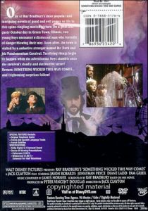 | One of Ray Bradbury's most popular and intriguing novels of good and evil comes to life in this spine-tingling motion picture. On a grim and gusty October day in Green Town, Illinois, two young boys encounter a distressed man who foretells of danger blowing their way. Soon after, the town is visited by a seductive stranger named Mr. Dark and his Pandemonium Carnival. Terrifying things begin to happen when the adventurous boys stumble onto the carnival's deadly and destructive secret! Beware: SOMETHING WICKED THIS WAY COMES...and frightening surprises follow! |