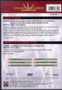 Things to Come is a stunning visualization of H g Wells' vision of the future with Raymond Massey as the leader of the new world. Journey To The Center Of Time is a scientist and his crew are hurled into a time trap when a giant reactor explodes. Stimulating, exciting and great fun. |