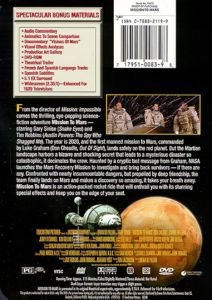 | From the director of Mission: Impossible comes the thrilling, eye-popping science-fiction adventure Mission To Mars -- starring Gary Sinise (Snake Eyes) and Tim Robbins (Austin Powers: The Spy Who Shagged Me). The year is 2020, and the first manned mission to Mars, commanded by Luke Graham (Don Cheadle, Out Of Sight), lands safely on the red planet. But the Martian landscape harbors a bizarre and shocking secret that leads to a mysterious disaster so catastrophic, it decimates the crew. Haunted by a cryptic last message from Graham, NASA launches the Mars Recovery Mission to investigate and bring back survivors -- if there are any. Confronted with nearly insurmountable dangers, but propelled by deep friendship, the team finally lands on Mars and makes a discovery so amazing, it takes your breath away. Mission To Mars is an action-packed rocket ride that will enthrall you with its stunning special effects and keep you on the edge of your seat. |