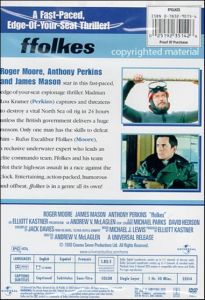 Roger Moore, Anthony Perkins and James Mason star in this fast-paced, edge-of-your-seat espionage thriller. Madman Lou Kramer (Perkins) captures and threatens to destroy a vital North Sea oil rig in 24 hours unless the British government delivers a hueg ransom. Only one man has the skills to defeat him - Rufus Excalibur Ffolkes (Moore), a reclusive underwater expert who leads an elite commando team. Ffolkes and his team plot their high-seas assault in a race against the clock. Entertaining, action-packed, humorous and offbeat, ffolkes is in a genre all its own! |