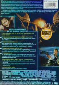 A New Introduction to the Film by Writer/Director David Twohy The Chronicles of Riddick Visual Encyclopedia - Cole Hauser hosts this exploration of Mercs, the Slam and other unique elements of the Riddick universe. Johns' Chase Log - Follow the bounty hunter, Johns (Cole Hauser), on his month-long hunt for Riddick. Includes excerpts from his personal log chronicling Riddick's final days of freedom before his capture, leading into the opening scene of Pitch Black Dark Fury: Advancing the Arc - An inside look at the making of The Chronicles of Riddick: Dark Fury, the visionary animated film film by acclaimed animator Peter Chung (The Animatrix, "Matriculated"). The Game is On - Join the ride Riddick's earlier life as he attempts to bust out of a triple-max security prison and get a sneak peek at the new The Chronicles of Riddick: Escape from Butcher Bay interactive game. The Making of Pitch Black Feature Commentaries Vin Diese, Cole Hauser and director David Twohy offer scene-by-scene insights into the film. The film's director, producer and visual effects supervisor discuss their exciting work on the film A View into the Dark - David Twohy and Vin Diesel explore the character of Riddick