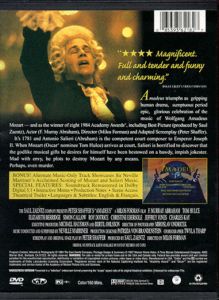 Amadeus triumphs as gripping human drama, sumptuous period epic, glorious celebration of the music of Wolfgang Amadeus Mozart--& as the winner of eight 1984 Academy Awards, including Best Picture (produced by Saul Zaentz), Actor (F. Murray Abraham), Director (Milos Forman) & Adapted Screenplay (peter Shaffer). It's 1781 & Antonio Saliere (Abraham) is the competent court composer to Emperor Joseph II. When Mozart (Oscar nominee Tom Hulce) arrives at court, Salieri is horrified to discover that the godlike musical gifts he desires for himself have been bestowed on a bawdy, impish jokester. Mad with envy, he plots to destroy Mozart by any means. Perhaps even murder. |