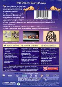 All New Bella Notte Music Video Disney Virtual Puppy DVD Rom: Adopt and care for your own virtual puppy. you can even teach him tricks! Disney Dog Trivia Virtual Board Game: Immerse yourself in this 3D game and test your knowledge of Disney dogs. PuppyPedia: Going To The Dogs Learn about the characters' real-life breeds. Your Inner Bark Personality Profile Never Before Seen Deleted Scenes Original 1943 Storyboard Version of the Film: Exciting secrets revealed about a different version of the film. Lady's Pedigree: The Making of Lady And The Tramp Finding Lady: The Art Of The Storyboard And Much, Much More! |
