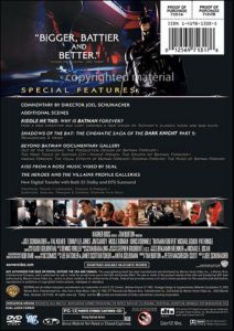 Additional Scenes Commentary by Joel Schumacher The Heroes and Villains Profile Galleries Music Video: "Kiss from a Rose" by Seal Riddle Me This: Why is Batman Forever? Shadows of the Bat: The Cinematic Saga of the Dark Knight, Part 5: Reinventing a Hero Theatrical Trailer