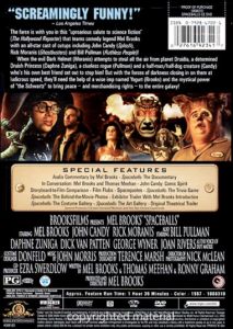 Audio Commentary by Mel Brooks Spaceballs: The Documentary John Candy: Comic Spirit Storyboard to Film Comparison In Conversation: Mel Brooks and Thomas Meehan Film Flubs Spacequotes Spaceballs: The Trivia Game Spaceballs: The Behind-the-Movie Photos Spaceballs: The Costume Gallery Spaceballs: The Art Gallery Exhibitor Trailer With Mel Brooks Introduction Original Theatrical Trailer |