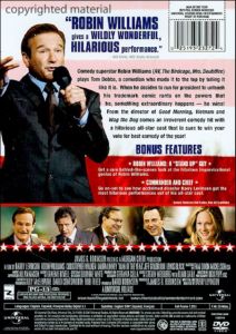 | Comedy superstar Robin Williams (RV, The Birdcage, Mrs. Doubtfire) plays Tom Dobbs, a comedian who made it to the top by telling it like it is. When he decides to run for president to unleash his trademark comic rants on the powers that be, something extraordinary happens - he wins! From the director of Good Morning, Vietnam and Wag The Dog comes an irreverent comedy hit with a hilarious all-star cast that is sure to win your vote for best comedy of the year! |