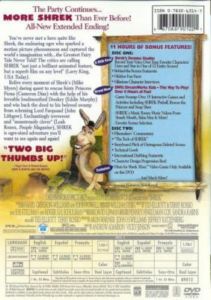 Disc 2 Filmmakers' Commentary "The Tech of Shrek" Storyboard Pitch of Outrageous Deleted Scenes Technical Goofs International Dubbing Featurette Character Design Progression Reel Hints for Shrek Xbox Video Game Only Available on this DVD