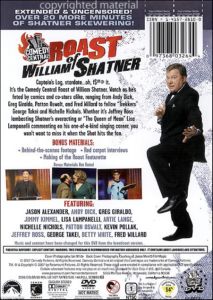 | Captain's Log, stardate... oh, f$#@ it. It's the Comedy Central Roast Of William Shatner. Watch as he's feted by comics and co-stars alike, ranging from Andy Dick, Greg Giraldo, Patton Oswalt, and Fred Willard to fellow "Trekkers" George Takei and Nichelle Nichols. Whether it's Jeffrey Ross lambasting Shatner's overacting or "The Queen of Mean" Lisa Lampanelli commenting on his one-of-a-king singing career, you won't want to miss it when the Shat hits the fan. |
