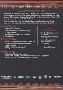 Disc 2 Explore the magic and majesty! Set your course for adventure across the continents or embark on chartered journeys. Timon & Pumbaa's Virtual Safai Bring a Theme Park Experience Into Your Living Room. Join Timon and Pumbaa For an Action-Packed Blast Through teh Wilds of Africa-in 5.1 Surround Sound Behind the Scenes Footage Character Designs Computer Animation African Art Inspiration Exclusive Interviews With Sir Elton John and Sir Tim Rice The Lion King Music Videos African Influence Disney Animals Learn How Real Animals Inspired These Animated Lion King Characters, Hosted by Roy Disney. Storymaking Magic Learn the Fascinating Origins and Influences Behind the Story of The Lion King THX Certified 9 Exclusive Character Portraits Sketched and Signed by the Original Animators The Ultimate Companion book The Journey