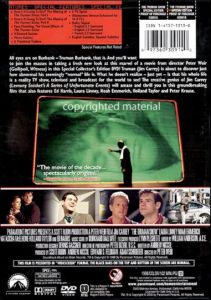 | All eyes are on Burbank - Truman Burbank, that is. And you'll want to join the masses in taking a fresh new look at this marvel of a movie from director Peter Weir (Gallipoli, Witness)) in this Special Collector's Edition DVD! Truman (Jim Carrey) is about to discover just how abnormal his seemingly "normal" life is. What he doesn't realize - just yet - is that his whole life is a reality TV show, televised and broadcast for the world to see! The creative genius of Jim Carrey (Lemony Snicket's A Series of Unfortunate Events) will amaze and thrill you in this groundbreaking film. |