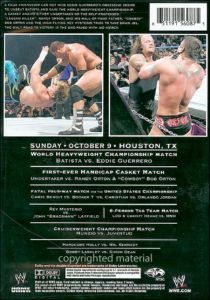 Sunday - October 9 - Houston, TX World Heavyweight Championship Match Batista vs. Eddie Guerrero First-Ever Handicap Casket Match Undertaker vs. Randy Orton & "Cowboy" Bob Orton Fatal Four-Way Match for the United Statres Championship Chris Benoit vs. Booker T vs. Christian vs. Orlando Jordan 6-Person Tag Team Match LOD & Christy Hemme vs. MNM Cruiserweight Championship Match Nunzio vs. Juventud Rey Mysterio vs. John "Bradshaw" Layfield Hardcore Holly vs. Mr. Kennedy Bobby Lashley vs. Simon Dean |