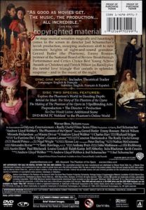 Disc One - Movie Theatrical Trailer Disc Two - Special Features Explore the Phantom's World in Dazzling Depth: Behind the Mask: The Story of the Phantom of the Opera The Making of The Phantom of the Opera in 3 Spellbinding Acts: Preproduction, The Director, Production No One Would Listen: Additional Scene DVD-ROM PC Weblink to the Phantom's Online World |