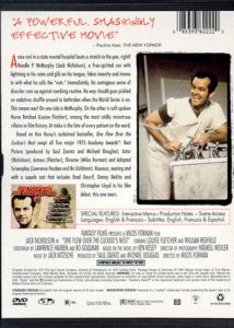 | A nice rest in a state mental hospital beats a stretch in the pen, right? Randle P. McMurphy (Jack Nicholas), a free-spirited con with lightning in his veins & glib on his tongue, fakes insanity & moves in with what he calls the "nuts." Immediately, his contagious sense of disorder runs up against numbing routine. No way should guys pickled on sedatives shuffle around in bathrobes when the World Series is on. This means war! On one side is McMurphy. On the other is soft-spoken Nurse Ratched (Louise Fletcher), among the most coldly monstrous villians in film history. At stake is the fate of every patient on the ward. |