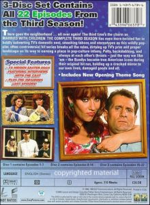 There goes the neighborhood...all over again! Third time's a charm as Married With Children the complete third season has even more twisted fun in boldly subverting TV's domestic nest, smashing taboos and stereotypes as this wildly popular, often controversial hit series broke all the rules, dirtying up TV's prim and proper landscape on its way to earning a place in pop-culture infamy. Petty, backstabbing, and always at each other's throats - just the way we like 'em - the Bundys became true American icons during their original hit run, holding up a cracked mirror to our own lives, damaged goods and all. |