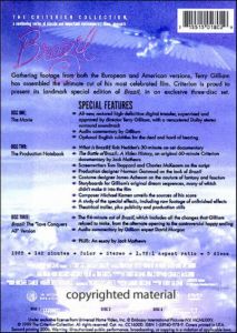 All-new restored high-definition digital transfer, supervised and approved by director Terry Gilliam, with a remastered Dolby stereo surround soundtrack Audio Commentary by Gilliam "What Is Brazil?" - Rob Hedden's 30-minute documentary "The Battle Of Brazil: A Video History" - Original 30-min Criterion documentary by Jack Mathews Screenwriters Tom Stoppard and Charles McKeown on the script Production designer Norman Garwood on the look of Brazil Costume designer James Acheson on the couture of fantasy and fascism Storyboards for Gilliam's original dream sequences, many of which didn't make it into the film Composer Michael Kamen unveils the sources of his score A study of the special effects, including raw footage of unifinished effects Theatrical trailer, plus publicity and production stills The 94-min cut of Brazil, which includes all the changes that Gilliam refused to make, from the alternate opening to the controversial happy ending Audio commentary by Gilliam expert David Morgan Plus: An essay by Jack Matthews |