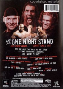 | For one night the rules do not apply as WWE superstars experience One Night Stand. Street Fight for the ECW World Championship - Mr. McMahon vs. Bobby Lashley Falls Count Anywhere Match for the WWE Championship - John Cena vs. Great Khali Steel Cage Match for the World Heavyweight Championship - Edge vs. Batista Ladder Match for the World Tag Team Championship - Hardys vs. The World's Greatest Tag Team Stretcher Match - Rob Van Dam vs. Randy Orton Lumberjack Match - Kane vs. Mark Henry Pudding Match - Melina vs. Candice Michelle Six-Man Tables Match - CM Punk, Tommy Dreamer & Sandman vs. Elijah Burke, Marcus Cor Von & Matt Striker |