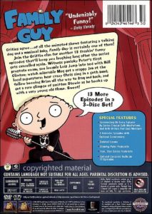 Commentary On Every Episode By Series Creator Seth MacFarlane, And With Writers And Cast Members 3 Animatic Episodes With Optional Commentary Deleted Scenes Drawing Peter Featurette Toys, Toys Galore Featurette Optional Censored Audio on 11 Episodes |