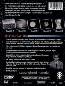 Audio Commentaries by Earl Holliman, Martin Landau, Rod Taylor, Martin Miler, Kevin McCarthy and William Self Vintage Audio Recollections with Burgess Meredith, Douglas Heyes, Richard L. Bare, Buck Houghtonj, Anne Francis and Richard Matheson Rod Serling Audio Lectures from Sherwood Oaks College Isolated Music Scores featuring the legendary Bernard Herrmann, Jerry Goldsmith and more Rod Serling Promos for "Next Week's" Show Rare Rod Sterling Appearances Highlights from the Musuem of Television and Radio Seminar |