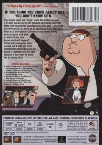 The laughs come full "Force" when the Griffin clan puts a freakin' sweet spin on the greatest sci-fi saga ever told! With Peter playing the swashbuckling Han Solo, Lois as the sexy Princess Leia, Chris as an adolescent Luke Skywalker, Brian as a well-spoken Chewbacca and Stewie finally embracing his dark side as Darth Vader, who knows what will happen? Filled with outrageous gags, spaced-out droids and more intergalactic satire than you can shake a lightsaber at, this epic spoof is a must-own for every fan of Family Guy! |