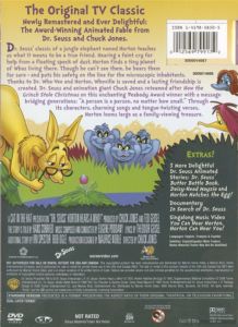 Dr. Seuss' classic of a jungle elephant named Horton teaches us what it means to be a true friend. Hearing a faint cry for help from a floating speck of dust, Horton finds a tiny planet of Whos living there. Though he can't see them, he hears them for sure - and puts his safety on the line for microscopic inhabitants. Thanks to Dr. Who-Vee and Horton, Whoville is saved and a lasting friendship is created. Dr. Seuss and animation giant Chuck Jones reteamed after How the Grinch Stole Christmas on this enchanting Peabody Award winner with a message bridging generations: "A person is a person, no matter how small". Through its characters, charming songs and tongue-twisting verse, Horton looms large as a family-viewing treasure. |