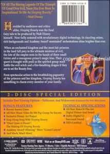 Heralded by audiences and critics alike, Sleeping Beauty was the final fairy tale to be produced by Walt Disney himself. Now fully restored with revolutionary digital technology, its dazzling colors, rich backgrounds, and Academy Award nominated orchestrations shine brighter than ever. When an enchanted kingdom and the most fair princess in the land falls prey to the ultimate mistress of evil, the fate of the empire rests in the hands of three small fairies and a courageous prince's magic kiss. Their quest is fraught with peril as the fellowship must battle the evil witch and a fire breathing dragon if they are to set the Beauty free. From spectacular action to the breathtaking pageantry of the princess and her kingdom, Sleeping Beauty has something to charm every member of your family. |
