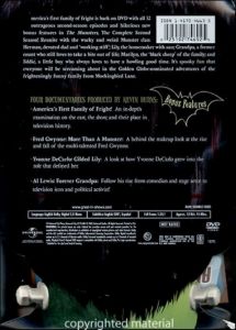 America's First Family Of Fright! - An in-depth examination on the cast, the show, and their place in television history. Fred Gwynne: More Than A Monster - A behind the makeup look at the rise and fall of the multi-talented Fred Gwynne. Yvonne De Carlo: Gilded Lily - A look how Yvonne DeCarlo grew into the role that defined her. Al Lewis: Forever Grandpa - Follow his rise from comedian and stage actor to television icon and political activist! |
