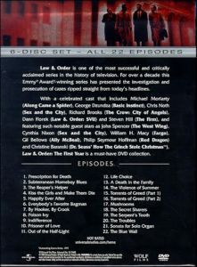 With a celebrated cast that includes Michael Moriarty (Along Came a Spider), George Dzundza (Basic Instinct), Chris Noth (Sex and the City), Richard Brooks (The Crow: City of Angels), Dann Florek (Law & Order: SUV) and Steven Hill (The Firm) and featuring such notable guest stars as John Spencer (The West Wing), Cynthia Nixon (Sex and the City), William H. Macy (Fargo)< Gil Bellows (Ally McBeal), Philip Seymour Hoffman (Red Dragon) and Christine Baranski (Dr. Seuss' How the Grinch Stole Christmas), Law & Order: The First Year is a must-have DVD collection.