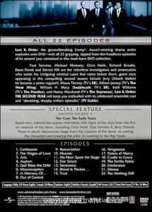 With a celebrated cast that includes Michael Moriarty (Along Came A Spider), Christ Noth (Sex And The City), Richard Brooks (The Crow: City Of Angels), Dann Florek (Law & Order: SVU) and featuring such notable guest stars as Jerry Orbach (Law & Order starting season 3 in a different role), Maura Tierney (ER), William H. Macy (ER), Lisa Nicole Carson (ER, Ally McBeal), Luis Guzman (Traffic) and Allison Janey (The West Wing). |