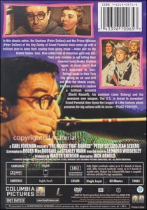 In this classic satire, the Duchess (Peter Sellers) and the Prime Minister (Peter Sellers) of the tiny Duchy of Grand Fenwick have come up with a brilliant plan to keep their country from going broke- make war on the United States, lose, then collect lots of American post-war aid. Their only mistake is not telling their invasion force leader (Sellers again, in chainmail!) that he's supposed to lose. Sellers lands in New York City during an air raid drill and finds the streets empty. He then proceeds to capture a brilliant scientist (David Kossoff), his assistant (Jean Seberg) and his awesome new weapon. The U.S. is forced to surrender! Grand Fenwick then forms the League of Little Nations which presents the big nations with its terms- PEACE FOREVER. |
